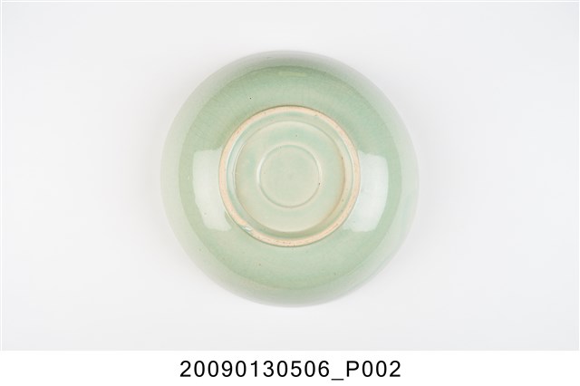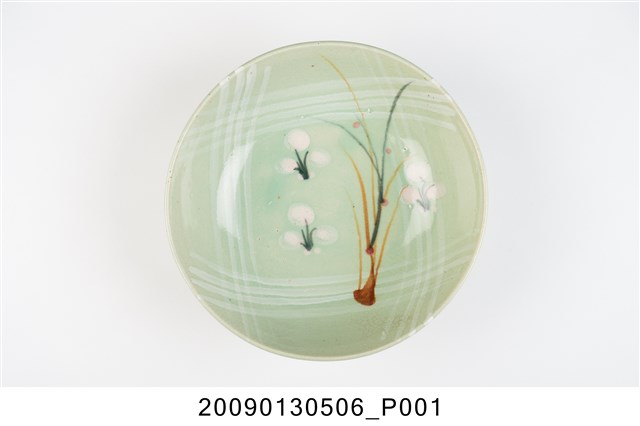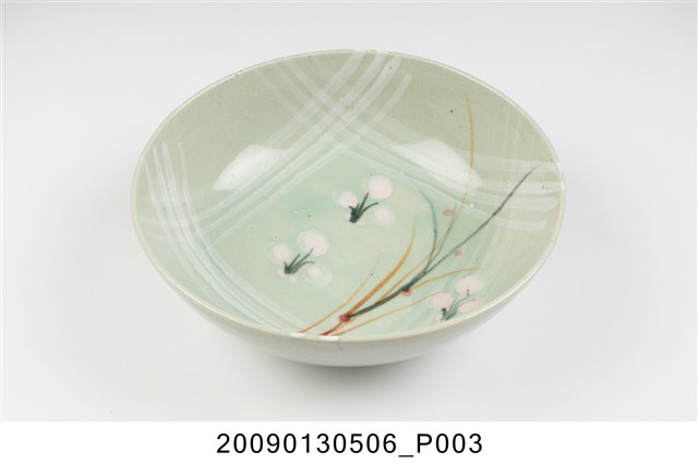 1.淡綠釉彩繪花卉紋碗,以模製成形,敞口,弧壁下收,圓腹,碗底寬大,底有圈足,圈足有一磕碰缺口,碗底心壓模同心圓造型。全器施淡綠釉,表面帶有氣孔,足底露胎,碗外壁素面無紋,釉面開片,主要紋飾繪於碗心,使用手繪裝飾技法,以褐、綠釉彩描繪枝葉,粉、白圓點妝點花朵,碗面刷毛白泥輕,由四條細直條紋組成四道寬帶,相互交錯形成格狀紋,作為背景以增添變化。2.鶯歌陶業發展大約始於清朝嘉慶年間,多以厚重的粗陶器為主,直到1937年中日戰爭爆發,陶瓷器取得不易,有北投工人轉往鶯歌發展,帶動鶯歌製碗業的發展。花卉紋為鶯歌碗盤上常見的紋飾之一,早期碗盤多只用青花裝飾,約1950年代業者開始使用粉紅彩搭配青花,之後又出現綠色、褐色等其他顏色的著色劑,發展出釉下多彩,使裝飾色彩應用更加多元。