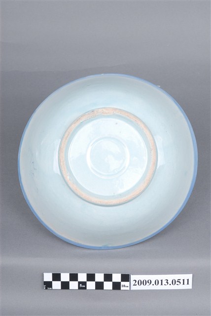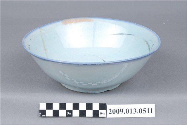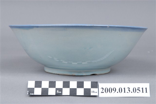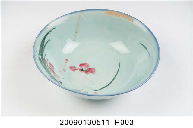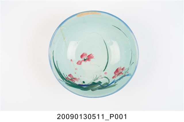 1.淡藍釉彩繪花卉紋碗,以模製成形,撇口,扁尖唇,弧壁下收,圓腹,碗底寬大,底有圈足。全器施淡藍釉,內壁口緣有一長條狀露胎,足底露胎,有一磕碰缺角。口沿施塗一圈青花鈷料裝飾,碗外壁素面無紋,碗底心壓印同心圓,主要紋飾繪於碗內壁一側,採沒骨技法描繪折枝花卉紋,可能為蘭花之類的花朵,三朵紅花均勻分布於青花、黛綠釉彩描繪的枝葉,花葉間再點綴紅色小花。2.北投自清朝即有窯業發展,日治時代受到重視,「北投窯業株式會社」為當時臺灣規模最大的陶瓷工廠,二戰後由政府接收,仍是全臺規模第一。北投陶瓷受到日本影響很深,許多裝飾題材、技法也從日本引進臺灣,約在日治時代後期至戰後初期,業者引進了氧化鉻作為色料,研發出粉紅色釉彩應用於花卉紋裝飾上,掀起一股流行。