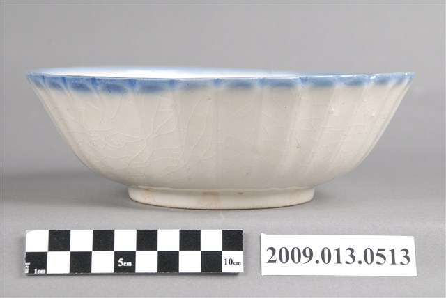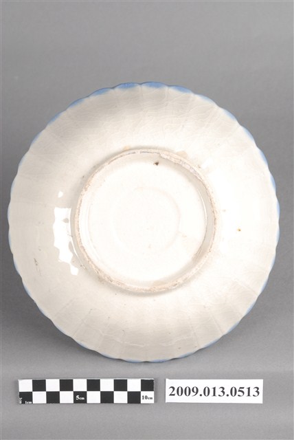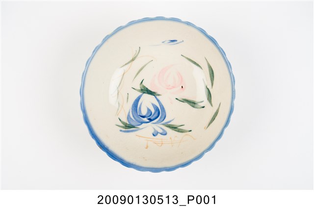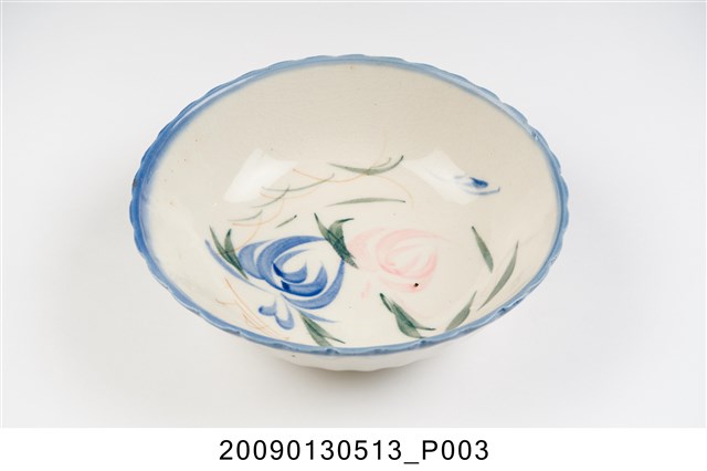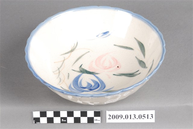 1.彩繪花卉紋菱花口碗,以模製成形,敞口,斜壁下收,圓腹,器底略微方折,底有圈足,口沿與碗外壁壓模裝飾菱花瓣造型,碗底心依稀可見壓模同心圓形造型,增添變化。全器施白釉,足底露胎,口沿施塗一圈青花鈷料裝飾,碗外壁釉面開片,主要紋飾繪於碗心,採沒骨技法描繪折枝花卉紋,以青花、粉紅彩兩朵大花為主題,周圍環繞黛綠色葉片和褐色細枝,構圖看似分散卻也生動活潑。2.北投自清朝即有窯業發展,日治時代受到重視,「北投窯業株式會社」為當時臺灣規模最大的陶瓷工廠,二戰後由政府接收,仍是全臺規模第一。北投陶瓷受到日本影響很深,許多裝飾題材、技法也從日本引進臺灣,約在日治時代後期至戰後初期,業者引進了氧化鉻作為色料,研發出粉紅色釉彩應用於花卉紋裝飾上,掀起一股流行。此碗口沿特意做成花口邊,頗具特色,葵花、菱花、荷花都是常見的花口造型。