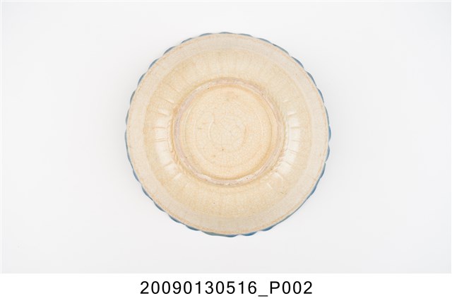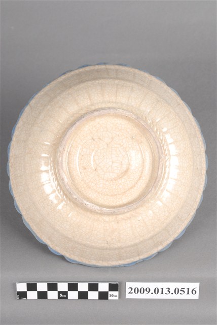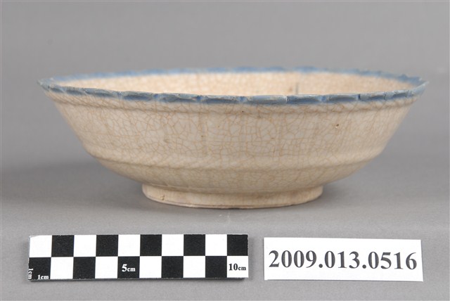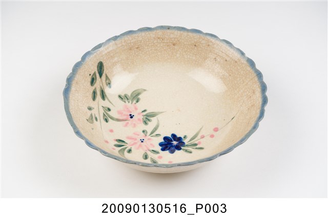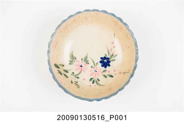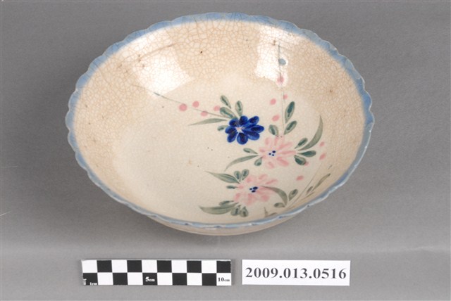 1.彩繪花卉紋菱花口碗,以模製成形,敞口,斜壁下收,器底略微方折,底有圈足,口沿作菱花造型,碗外壁以壓模裝飾,口沿下方、腹部中段與圈足周圍裝飾三圈繩紋,上下裝飾雙層直線紋對應口沿菱花瓣造型,碗底心亦壓模兩圈同心圓形造型,增添變化。全器施白釉,足底露胎,口沿施塗一圈青花鈷料裝飾,釉面佈滿細小開片,帶有黃褐色汙漬,使得釉裂紋路更為明顯。主要紋飾繪於碗內壁一側,採沒骨技法描繪折枝花卉紋,可能為雛菊之類的花朵,三朵青花、粉紅花朵相互爭豔,旁以綠色花葉烘托,花葉間點綴粉紅小花作為陪襯。2.北投自清朝即有窯業發展,日治時代受到重視,「北投窯業株式會社」為當時臺灣規模最大的陶瓷工廠,二戰後由政府接收,仍是全臺規模第一。北投陶瓷受到日本影響很深,許多裝飾題材、技法也從日本引進臺灣,約在日治時代後期至戰後初期,業者引進了氧化鉻作為色料,研發出粉紅色釉彩應用於花卉紋裝飾上,掀起一股流行。此碗口沿特意做成花口邊,頗具特色,葵花、菱花、荷花都是常見的花口造型。