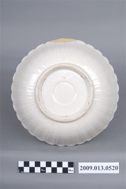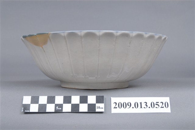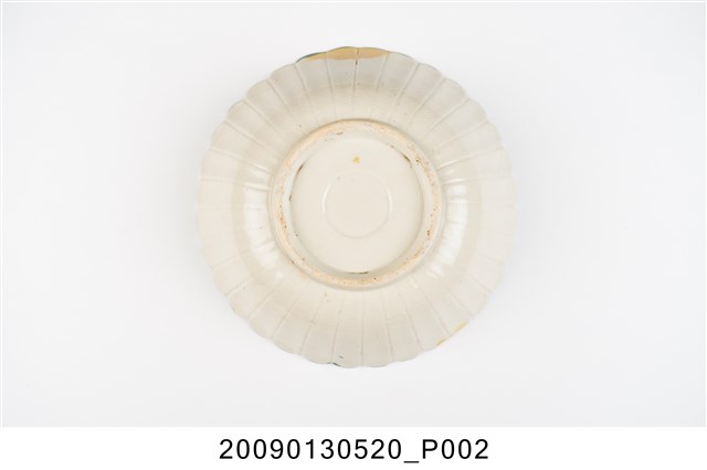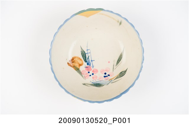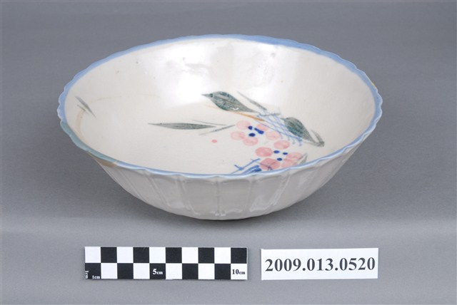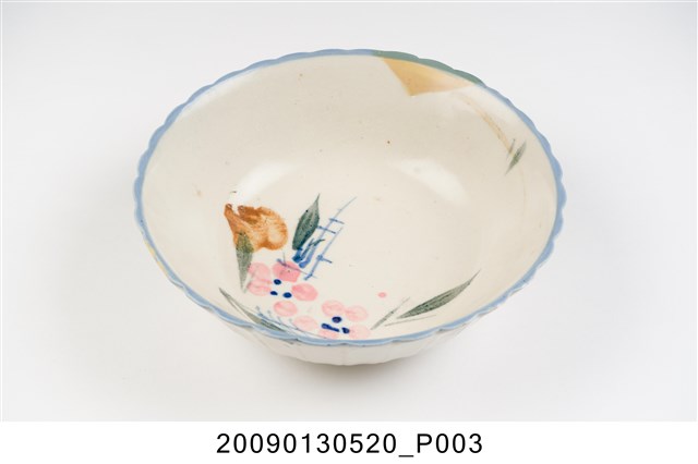 1.彩繪花卉紋菱花口碗,以模製成形,口微外撇,弧壁下收,圓腹,底有圈足,口沿與碗外壁壓模裝飾菱花瓣造型,碗底心壓模同心圓形造型,增添變化。全器施白釉,足底露胎,口沿施塗一圈青花鈷料裝飾,主要紋飾繪於碗心,以青花、粉紅彩描繪花卉,旁襯綠葉和褐色色塊。碗口緣有一三角形褐色色塊,應是施作時不小心沾到釉料所致。2.此碗口沿特意做成花口邊,頗具特色,葵花、菱花、荷花都是常見的花口造型。