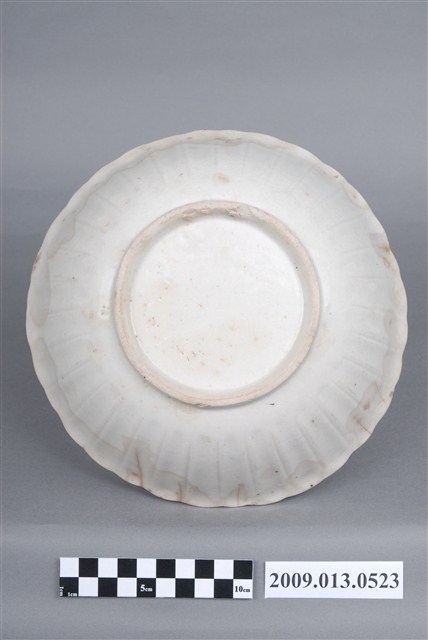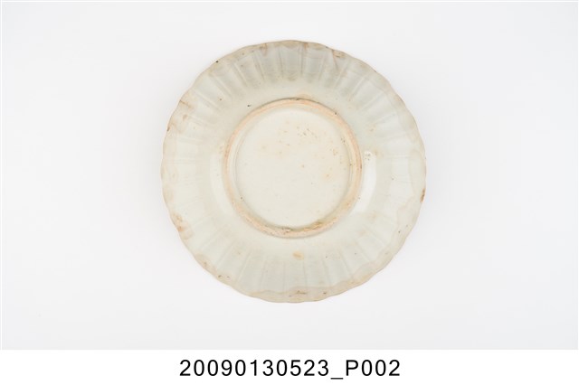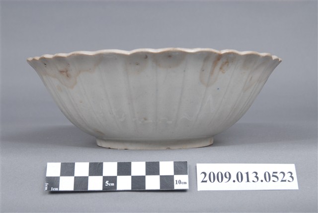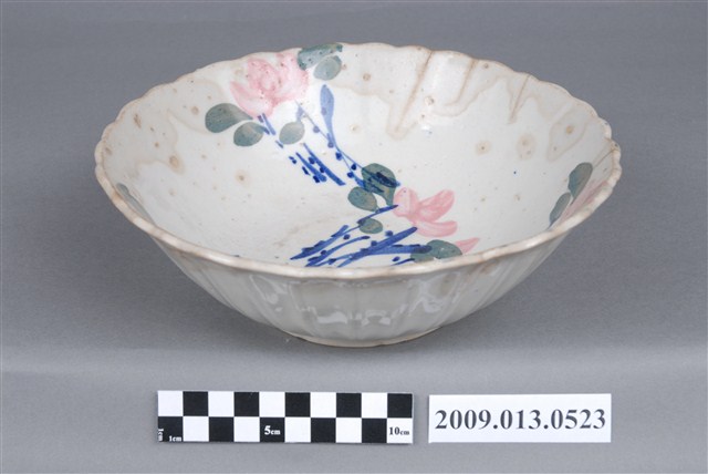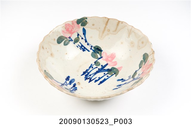 1.彩繪花卉紋菱花口碗,以模製成形,撇口,弧壁下收,圓腹,底有圈足,口沿作菱花造型,碗外壁壓模裝飾直線紋對應口沿菱花瓣造型。全器施白釉,足底露胎,釉面帶有氣孔和黃褐色汙漬斑點,口緣有大片汙漬痕及直裂紋。主要紋飾繪於碗內壁和碗心,大致可分為四組構圖相同的圖案,每組圖案由青花花枝、黛綠葉片和粉紅花朵組成花束,其中一組花束位於碗心,其餘三組花束等距離環繞於碗內壁周圍。2.鶯歌陶業發展大約始於清朝嘉慶年間,多以厚重的粗陶器為主,直到1937年中日戰爭爆發,陶瓷器取得不易,有北投工人轉往鶯歌發展,帶動鶯歌製碗業的發展。早期碗盤多只用青花裝飾,約1950年代業者開始使用粉紅彩搭配青花,之後又出現綠色、褐色等其他顏色的著色劑,發展出釉下多彩,使裝飾色彩應用更加多元。此碗口沿特意做成花口邊,頗具特色,葵花、菱花、荷花都是常見的花口造型。