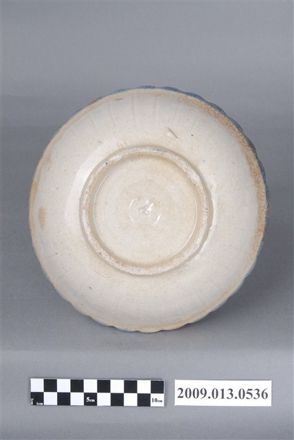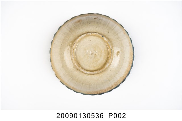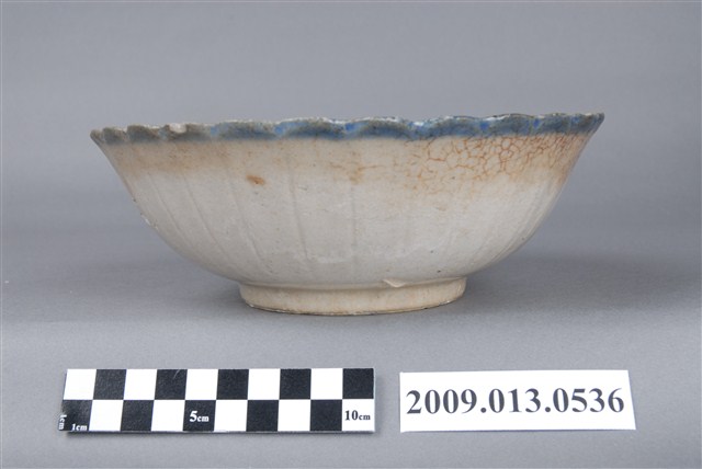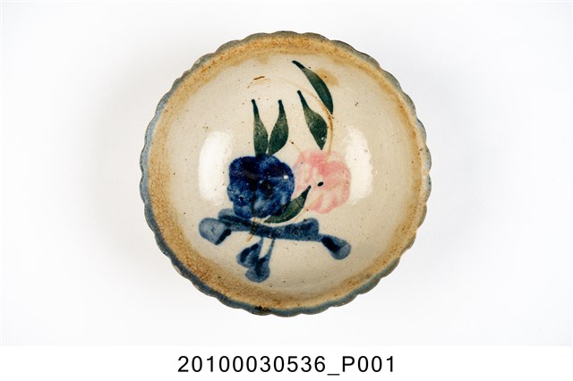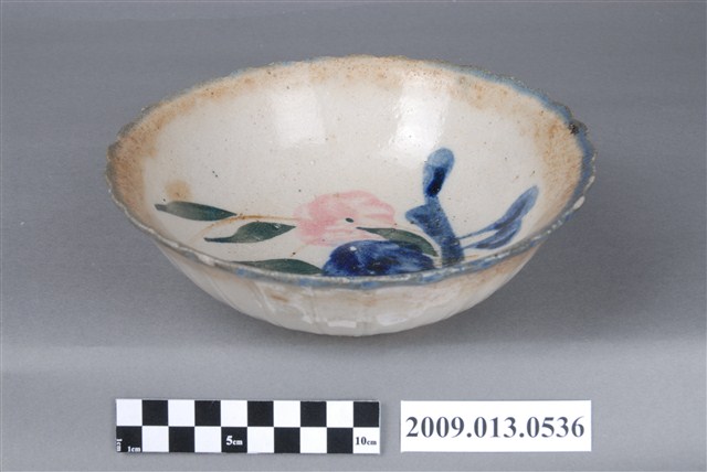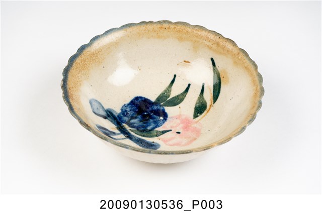 1.彩繪花卉紋菱花口碗,以模製成形,撇口,弧壁下收,圓腹,底有圈足,口沿與碗外壁壓模裝飾菱花瓣造型,碗底心依稀可見壓模小的同心圓形造型。全器施白釉,足底露胎,口沿施塗一圈青花鈷料裝飾,主要紋飾繪於碗心,採沒骨技法描繪折枝花卉紋,青花、粉紅花朵相互爭豔,旁以綠色花葉烘托,再以褐彩勾勒出細枝。內外口沿下方一圈黃褐汙漬,釉面開片明顯,口沿有一磕碰缺角。2.鶯歌陶業發展大約始於清朝嘉慶年間,多以厚重的粗陶器為主,直到1937年中日戰爭爆發,陶瓷器取得不易,有北投工人轉往鶯歌發展,帶動鶯歌製碗業的發展。花卉紋為鶯歌碗盤上常見的紋飾之一,早期碗盤多只用青花裝飾,約1950年代業者開始使用粉紅彩搭配青花,之後又出現綠色、褐色等其他顏色的著色劑,發展出釉下多彩,使裝飾色彩應用更加多元。此碗口沿特意做成花口邊,頗具特色,葵花、菱花、荷花都是常見的花口造型。