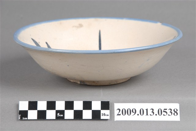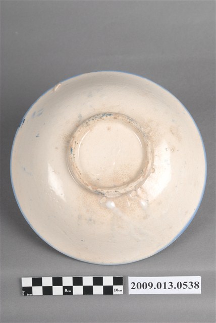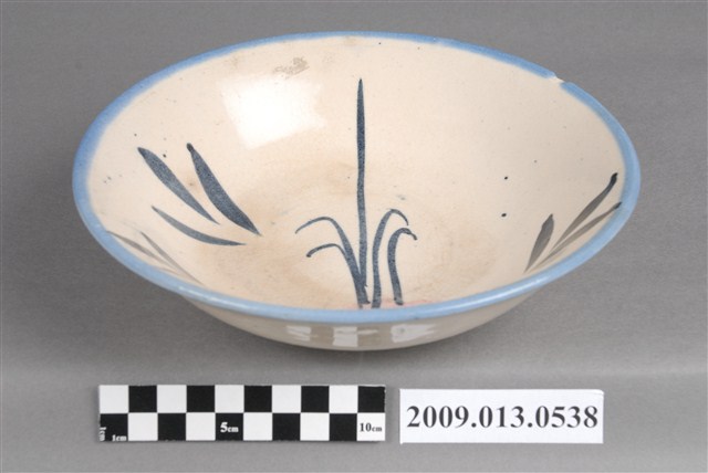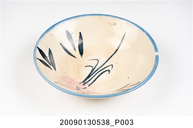 1.青花粉紅彩花卉紋碗,以模製成形,撇口,扁尖唇,弧壁下收,圓腹,底有圈足。全器施白釉,足底露胎,圈足周圍有縮釉痕跡,口沿施塗一圈青花鈷料裝飾,有一磕碰缺口。碗外壁素面無紋,有些許沾染到青釉鈷料所留下的斑點,主要紋飾繪於碗內壁,以1950年代流行的青花粉紅彩,採沒骨技法描繪折枝花卉紋,一朵盛開的粉紅花朵為主題,兩旁襯以青花長形葉片,花朵上方長條花蕊凸出貫穿碗心,豐富了整個畫面。2.鶯歌陶業發展大約始於清朝嘉慶年間,多以厚重的粗陶器為主,直到1937年中日戰爭爆發,陶瓷器取得不易,有北投工人轉往鶯歌發展,帶動鶯歌製碗業的發展。花卉紋為鶯歌碗盤上常見的紋飾之一,早期碗盤多只用青花裝飾,約1950年代業者開始使用粉紅彩搭配青花,之後又出現綠色、褐色等其他顏色的著色劑,發展出釉下多彩,使裝飾色彩應用更加多元。