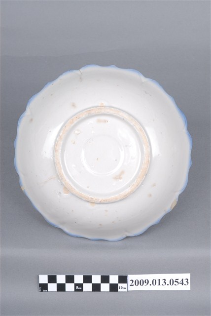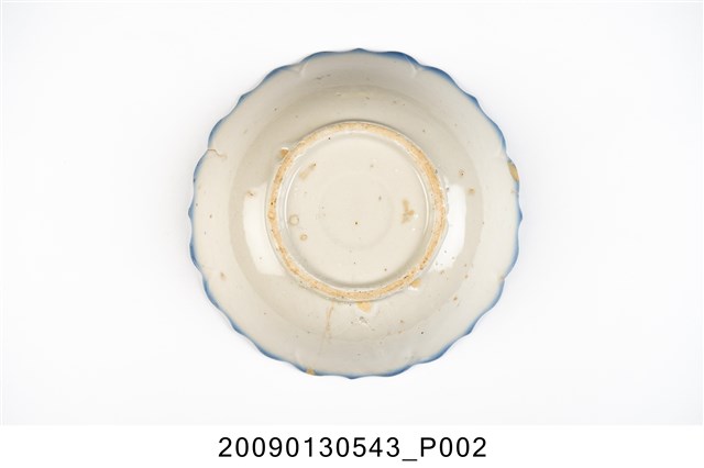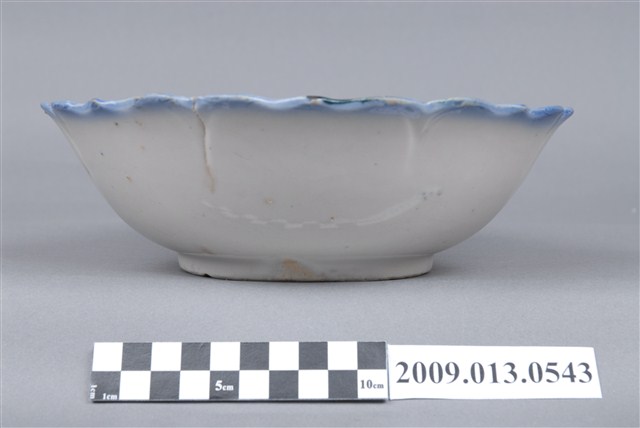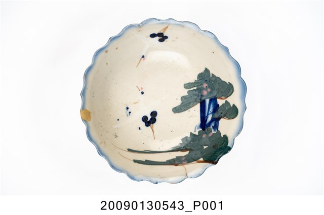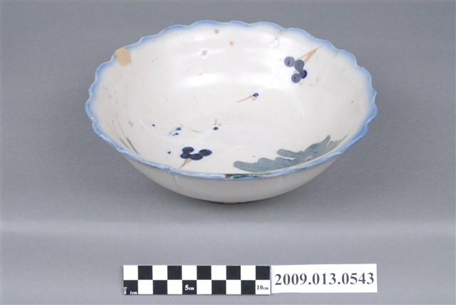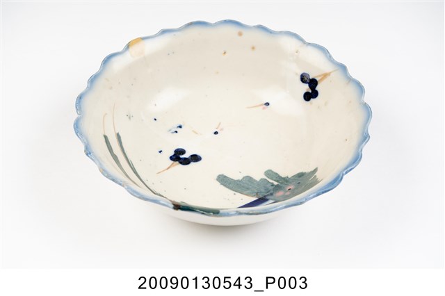 1.彩繪雙鶴綠樹紋菱花口碗,以模製成形,撇口,弧壁下收,圓腹,底有圈足,口沿作八大瓣尖角和圓弧組成的菱花造型,碗底心壓模同心圓形造型。全器施白釉,釉層厚重,表面帶有氣孔,口沿施塗一圈青花鈷料裝飾,有一直裂紋和一處缺角露胎。碗外壁素面無紋,主要紋飾繪於碗內壁,一側以青花和黛綠釉彩描繪枝葉繁茂的樹木,並點綴粉紅小花,樹的左方和上方繪有兩隻展翅飛翔的仙鶴,粉紅彩點出了「鶴頂紅」,鶴的脖子與翅膀顏色與背景相似,需仔細觀看才能辨別出形體。2.丹頂鶴是東南亞地區特有的鳥種,平均壽命約五十至六十年,是鳥類中較長壽的,其體態纖細優美、顏色黑白分明,被賦予幸福、吉祥、忠貞、長壽的寓意,在中國古代傳說中,仙人常與丹頂鶴相伴,因此丹頂鶴又被稱作「仙鶴」。鶯歌碗盤上所繪的都是丹頂鶴,成為一種特色。