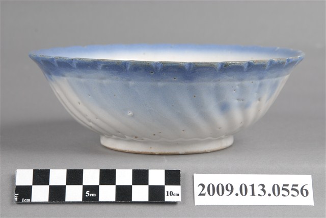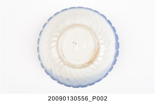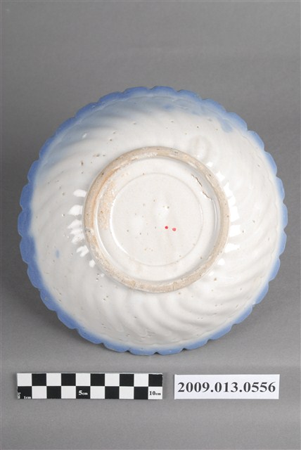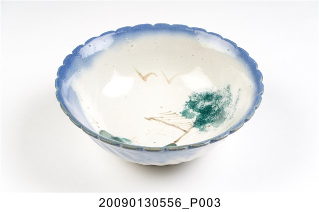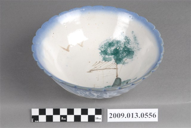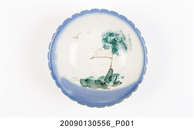 1.彩繪湖景紋菱花口碗,以模製成形,撇口,弧壁下收,圓腹,底有圈足,口沿作菱花造型,碗外壁口沿下方壓模裝飾雙線弦紋,以下裝飾螺旋紋造型至圈足,碗底心壓模裝飾同心圓造型,增添變化。全器施白釉,表面氣孔明顯,口沿施塗一圈青花鈷料裝飾,碗內以手繪裝飾技法描繪水岸風景,大片青花色塊表現近水,並延伸至外壁,水岸以墨綠色塊表現岩石,黛綠釉彩點繪草叢和樹葉,褐彩線條勾勒土地、房舍、孤舟與飛鳥。2.鶯歌陶業發展大約始於清朝嘉慶年間,多以厚重的粗陶器為主,直到1937年中日戰爭爆發,陶瓷器取得不易,有北投工人轉往鶯歌發展,帶動鶯歌製碗業的發展。早期碗盤多只用青花裝飾,約1950年代業者開始使用粉紅彩搭配青花,之後又出現綠色、褐色等其他顏色的著色劑,發展出釉下多彩,使裝飾色彩應用更加多元。