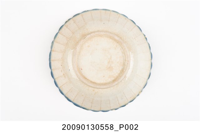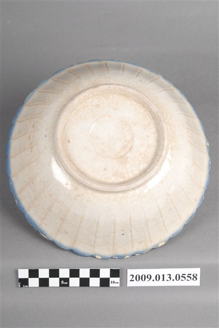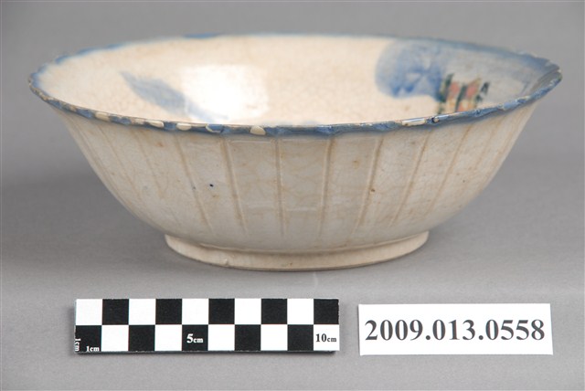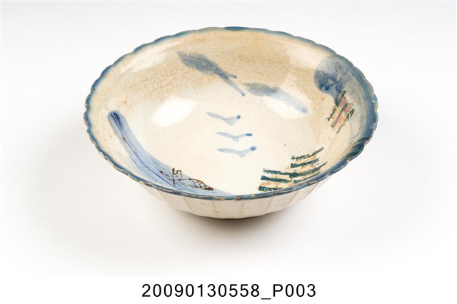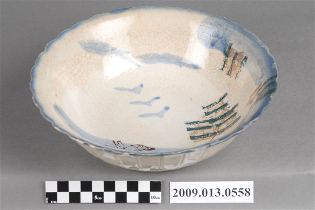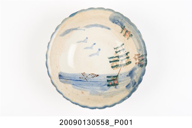 1.彩繪印花山水紋菱花口碗,以模製成形,撇口,弧壁下收,圓腹,底有圈足,口沿與碗外壁壓模裝飾菱花瓣造型,碗底心壓模裝飾同心圓造型,增添變化。全器施白釉,釉面開片、泛黃,口沿施塗一圈青花鈷料裝飾,碗內併用手繪和印花裝飾技法,主要以青花鈷料描繪海景、山壁、遠山與飛鳥,山壁上的房舍及海上孤舟與船夫線條細膩工整,是採褐彩印花裝飾,水面與山壁上的小島、樹木也是使用黛綠和褐彩蓋印長方形色塊表現,再以手工點綴粉紅彩小圓點。2.鶯歌陶業發展大約始於清朝嘉慶年間,多以厚重的粗陶器為主,直到1937年中日戰爭爆發,陶瓷器取得不易,有北投工人轉往鶯歌發展,帶動鶯歌製碗業的發展。海景紋是鶯歌碗盤中常見的山水紋飾,常見的構圖為岸上有樹木、岩石、房舍,蔚藍的海面上漂浮著的船隻,上方繪有遠山及飛鳥,此類紋飾自日治時期開始被應用至碗盤上,二戰後仍被沿用。