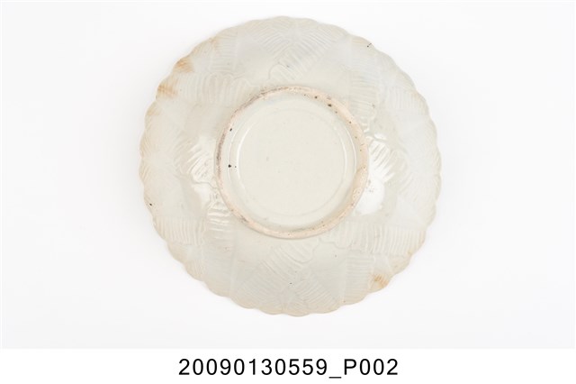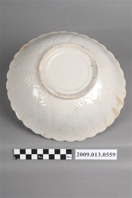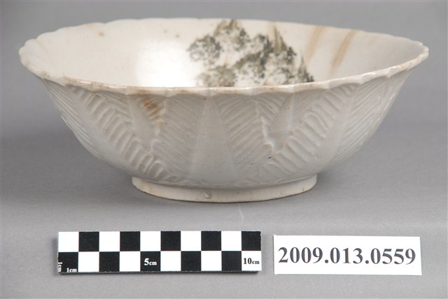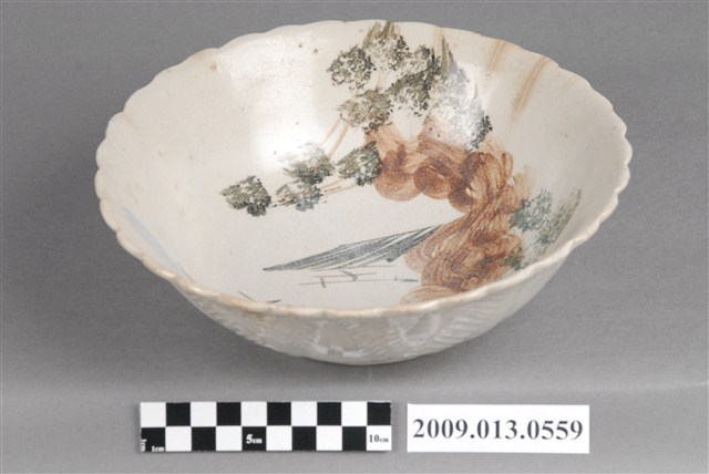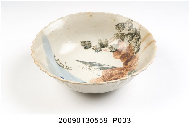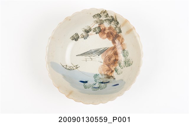 1.彩繪湖景紋菱花口碗,以模製成形,撇口,弧壁下收,圓腹,底有圈足。口沿作菱花造型,碗外壁壓模裝飾蕉葉紋,碗底心壓模裝飾同心圓造型,增添變化。全器施白釉,足底露胎,口沿有三道較明顯的短直裂紋。碗內併用手繪和印花裝飾技法,大筆淡藍釉彩表現近水,加上幾筆青花水波,墨綠彩細筆勾勒房舍和小船,右側褐彩繪出高大粗壯的樹幹,綠葉和水中倒影仔細觀看可見重複相似的圖樣,應是以印花技法裝飾。2.北投自清朝即有窯業發展,日治時代受到重視,「北投窯業株式會社」為當時臺灣規模最大的陶瓷工廠,二戰後由政府接收,仍是全臺規模第一。北投陶瓷受到日本影響很深,許多裝飾題材、技法也從日本引進臺灣,山水紋飾即是其中一個例子。構圖大多是左側海洋中有出航的船舶,右側岸上有屋舍、樹木,有時遠方有山峰浮現,此類紋飾自日治時期開始被應用至碗盤上,二戰後仍被沿用。