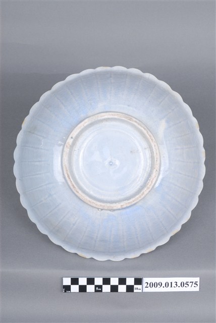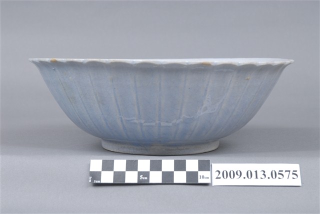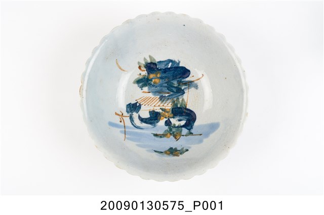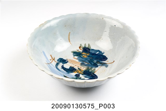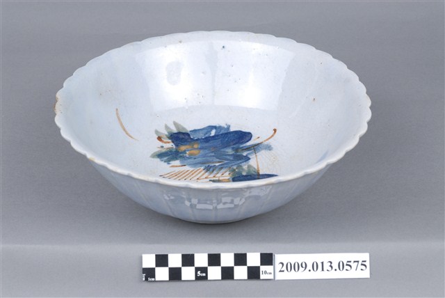 1.淡藍釉彩繪湖水風景紋碗,以模製成形,撇口,弧壁下收,圓腹,底有圈足,口沿與碗外壁壓模裝飾菱花瓣造型,碗底心壓模裝飾同心圓造型,增添變化。全器施淡藍釉,足底露胎,碗外壁與碗心細小開片,碗內壁有氣孔。碗心採手繪技法描繪湖水風景,大筆淡藍色塊描繪近水,褐色細線勾勒出隱藏其中的房舍屋簷、飄泊在水上的孤舟及空中飛鳥,青花與綠彩交疊出岩石和樹叢,運筆粗礦隨意。2.鶯歌陶業發展大約始於清朝嘉慶年間,多以厚重的粗陶器為主,直到1937年中日戰爭爆發,陶瓷器取得不易,有北投工人轉往鶯歌發展,帶動鶯歌製碗業的發展。海景紋是鶯歌碗盤中常見的山水紋飾,常見的構圖為岸上有樹木、岩石、房舍,蔚藍的海面上漂浮著的船隻,上方繪有遠山及飛鳥,此類紋飾自日治時期開始被應用至碗盤上,二戰後仍被沿用。