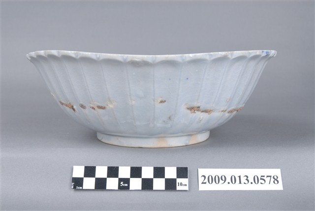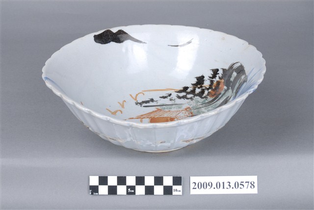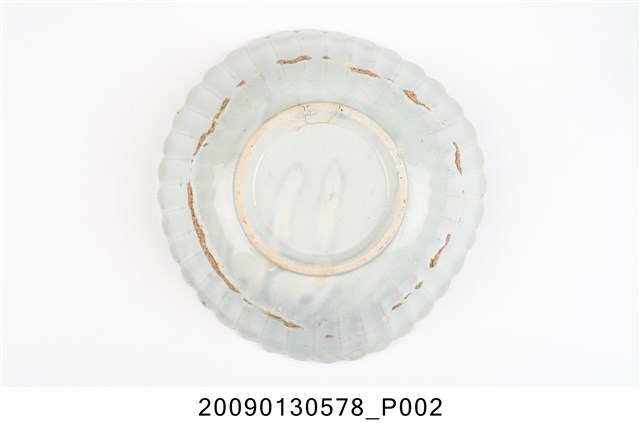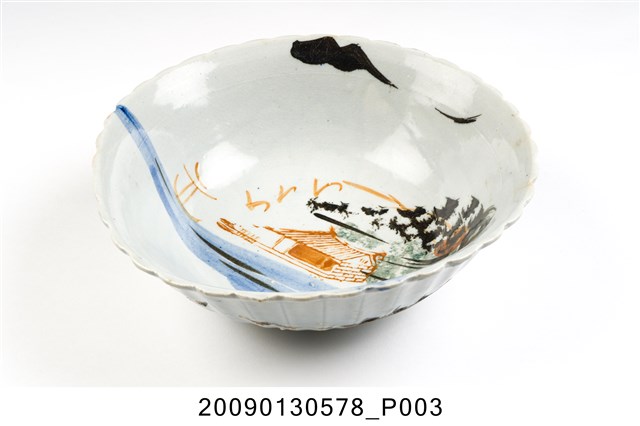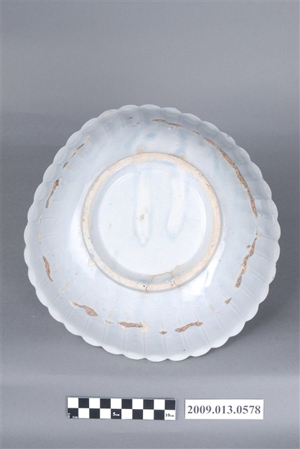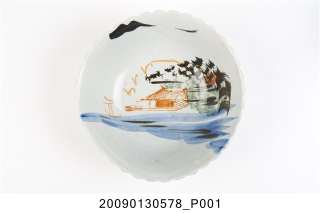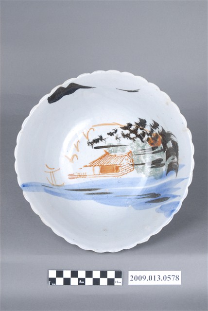 2009.013.0578 淡藍釉彩繪印花山水紋菱花口碗