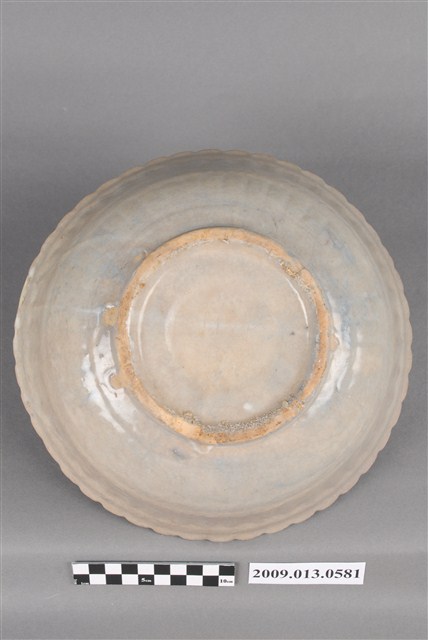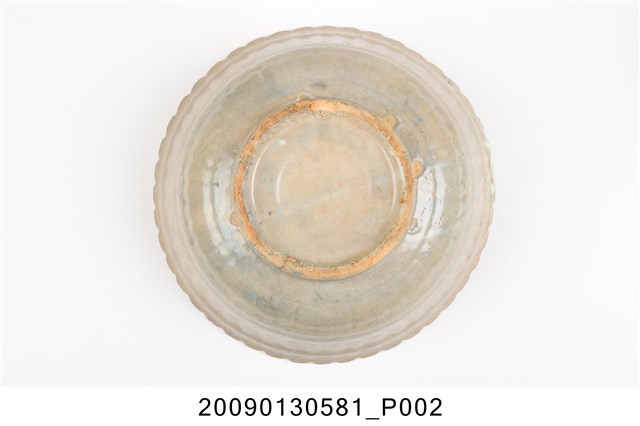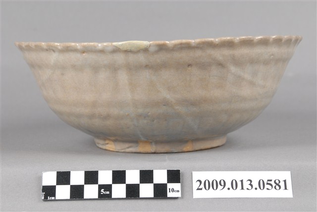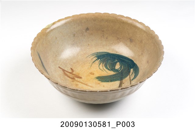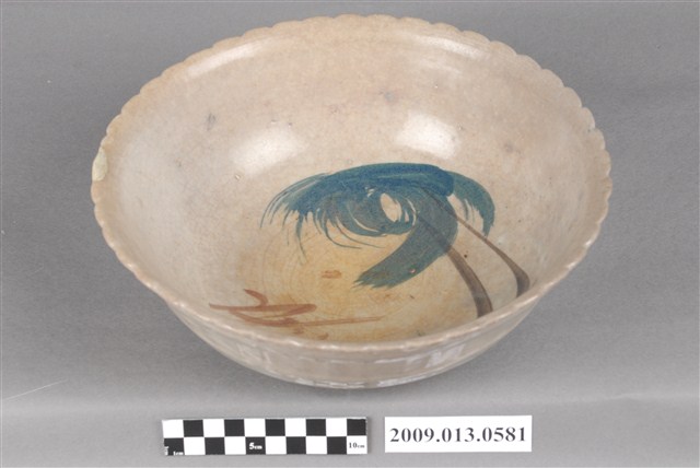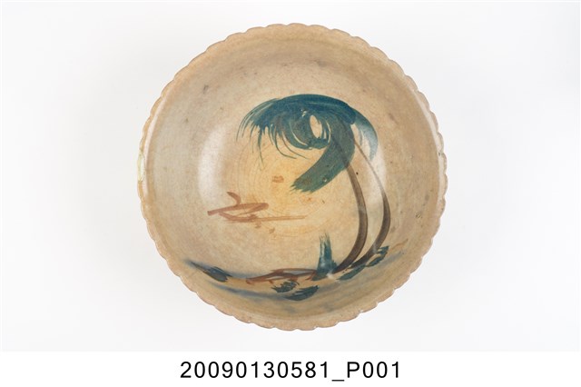 1.彩繪椰樹海景紋菱花口碗,以模製成形,撇口,弧壁下收,圓腹,底有圈足,口沿作菱花造型,碗外壁以壓模裝飾菱花瓣造型,口沿下方和腹部中段壓模裝飾寬橫紋,碗底心依稀可見壓模同心圓形造型。全器施淡藍釉,厚重的釉層覆蓋了壓模裝飾的紋路,表面有黃褐色汙漬痕,圈足旁縮釉露胎,口沿有一補丁痕跡。碗內採手工裝飾技法,右方以黑色釉彩畫出細長高大的椰子樹幹,綠色大筆曲線表現樹葉,下方幾筆褐色和淡青色橫線做沙灘海景與綠色草叢,遠方的褐色線條隨意畫出小船,整體筆觸粗礦隨意。2.椰樹海景紋為鶯歌碗盤上常見且有特色的紋飾,海邊高大的椰樹常被畫在碗盤的左方或右方,佔據主要地位。椰子樹多生長在南臺灣地區,日治時期的畫家便注意到臺灣南北景色不同,而將具南國風情的地方特色入畫,並應用至其他器皿上,且一直到二戰後70、80年代。