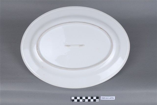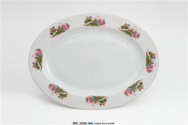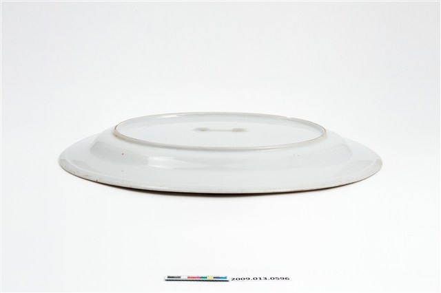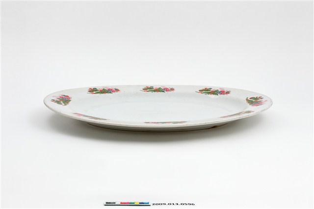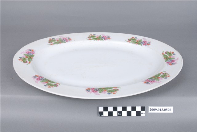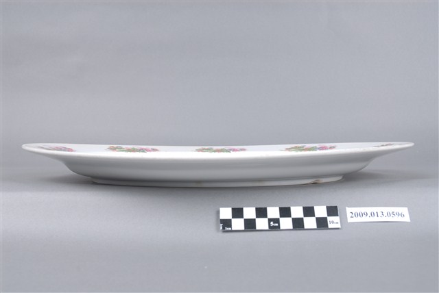 1. 本件橢圓盤侈口、寬折沿,淺腹,圈足露胎。折沿以青花印有八處花菓紋飾,圖案中藍、粉、紅三色花朵競相綻放,葉片搖曳多姿,朱果玲瓏可愛,整體佈局工整,色調清新。2. 早期臺灣碗盤多以彩繪的形式表現紋飾,後因大量生產,逐步以印花工藝替代人工手繪。印花技術是先以圖案製作出印章,再透過印章將彩料印在瓷器上,其優點是圖案一致,色彩豐富且便於機械化流水作業。
