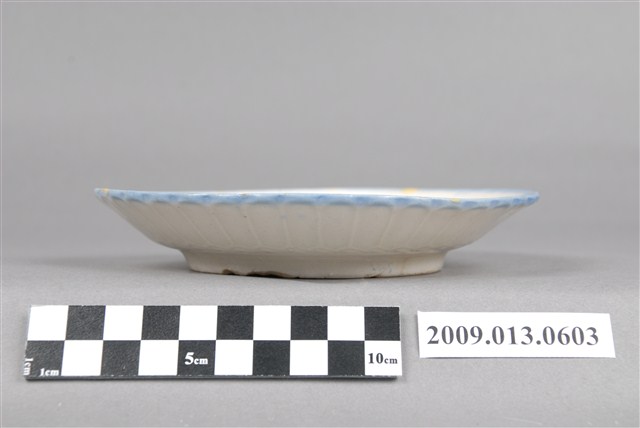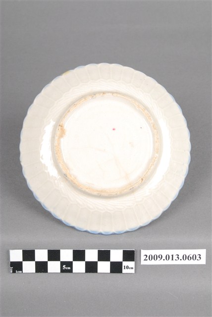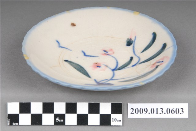圓盤。白陶,仰鏇壓法製作,無底款。此圓盤用以裝盛菜肴。平底,弧腹,器底飾淺浮雕蓮瓣紋,波紋狀器緣,圓唇,以仰式鏇壓法製作,低圈足。無款識,臺灣鶯歌地區製品,但窯場不詳。白陶胎質。全器以釉下彩繪裝飾,器緣畫出青色邊框,主要紋飾偏右側,以花卉紋裝飾。先青花色料畫出地面線與S形的枝幹,再畫上牛角形的葉片,枝條末稍畫著三朵圓形的花朵與一個花苞。畫面左邊中間以青色線條畫上兩隻飛鳥,增添畫面的生氣。全器施以透明釉,釉面開片與褐點。畫面使用的色料除了青花粉紅彩之外,還使用新的綠色元素。整個畫面簡潔,構圖疏朗,曲折的線條增加了動感。但所畫的紋飾看不出是何種花卉,實為一種抽象的表現。