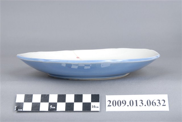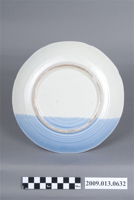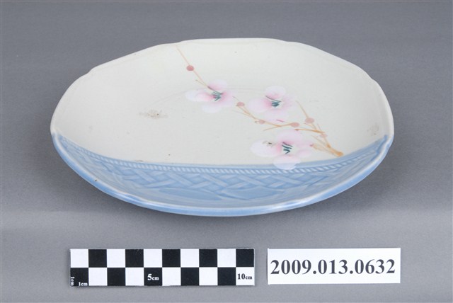 圓盤。白陶,覆鏇壓法製作,無底款。此圓盤用以裝盛菜肴。葵瓣形器沿,器緣略平折,圓唇,弧腹,以覆式鏇壓法製作,低圈足,近圈足處有四道同心圓凸起。無款識,屬於臺灣北部北投、淡水或鶯歌製品,但窯場不詳。胎質細緻,但未達瓷化程度,屬於白陶質。器體正面下方三分之一處印有淺深雕繩紋、蓆紋、與魚紋,並以浸釉法施以淺藍色透明釉,釉藥厚處顏色較深,薄處較淺,具有宋代影青瓷的特色。全器以釉下彩繪裝飾,器面畫上一棵梅花,三朵花盛開,花瓣使用類似粉彩的材料,呈現由粉紅到白色漸層而浮凸的效果,中間點上綠色的花蕊。另以淺褐色線條畫出梅花的枝條,並點上圓形的花苞,造形較為寫實。全器施以淡綠色透明釉,下方施以淡青色釉,釉面因為日久使用而有開片的現象。整個主題豐富,但呈現簡潔之風。