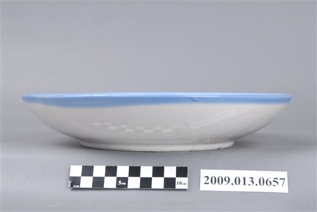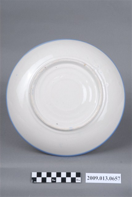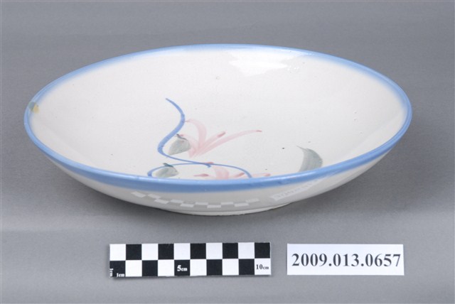 大圓盤。白陶,仰鏇壓法製作,無底款。此圓盤用以裝盛菜肴。平底,圓腹,圓唇,低圈足。無款識,臺灣鶯歌地區的製品。白陶胎。全器施以白色化粧土後,以釉下彩繪裝飾,器緣畫上淺藍色邊線。器面下方彩繪折枝花卉,以青花色畫上流轉的S形細線條枝幹,中間飾有兩朵粉紅色百合花狀的長瓣花朵,旁邊四片大小不等的綠葉。全器施以透明釉後入窯燒製,釉面有些斑點。畫面有許多留白,構圖疏朗,但主紋飾的結構不夠緊密,各個部分有飄浮在空中的感覺。沒有描繪具象的花卉,是這類產品常見的風格。