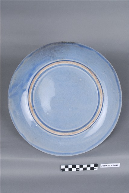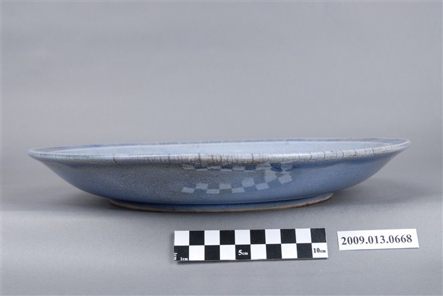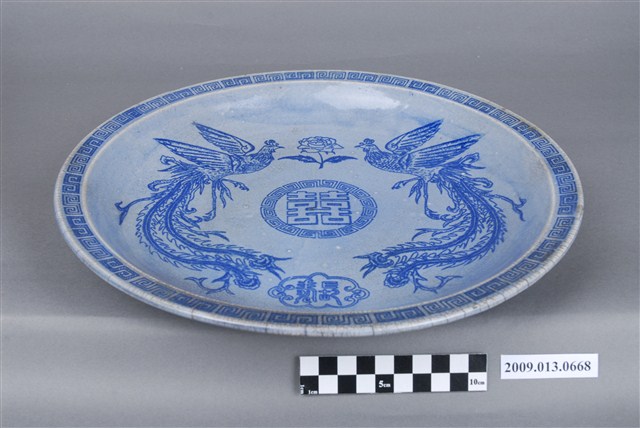 大圓盤。白陶,覆鏇壓法製作,題款:囍;長壽;無底款。大圓盤主要用於宴會上盛裝菜肴。平底,圓腹,圓唇,折沿。以覆鏇壓成形法製作,低圈足。白陶質。無底款,器面有雙喜紋與「長壽」款,屬於臺灣北部地區的製品,但窯場不詳。全器施以淡青色化粧土後以釉下彩青花轉寫技術裝飾,折沿上飾有一環連續的回紋。器面飾有龍鳯紋,兩首中間有一朵玫瑰花,器腹飾有團囍紋,周圍環繞回紋。下方有一如意狀紋飾,裡面有吉祥語「長壽」二字。整個紋飾為傳統的中國吉祥畫。紋飾由畫家設計後,以棉紙為載具,印上青花色料後成為轉寫紙,再轉貼在器面上,除去棉紙後,施以透明釉入窯燒製而成,是一種量產化的釉下彩裝飾技術。這種產品在市面上很受歡迎,流行一時。全器罩以透明釉,釉面有細碎的開片,並有少許針孔與斑點。