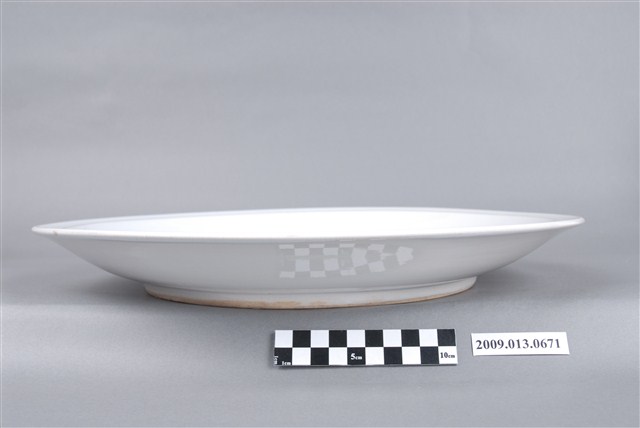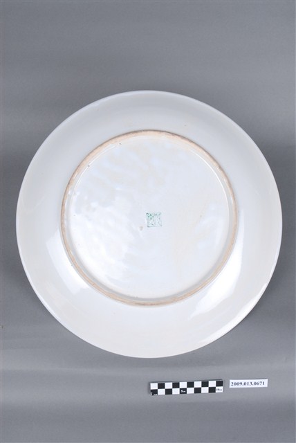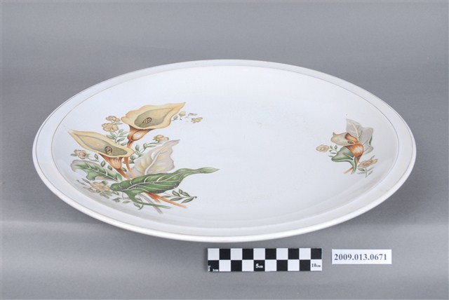 大圓盤,直徑將近40公分,不用於一般家庭,而用於宴會上裝盛拼盤之類的菜肴。胎質細緻,屬於瓷質。全器施以透明釉後,入窯燒製,釉面完美。覆鏇壓法製作,平底,圓腹,圓唇,折沿,低圈足。圈足中心藍色方形「俊男」篆體款,應是臺灣北投的小陶瓷廠。全器以釉上彩裝飾,折沿兩邊各畫有一道金色邊線。器心大部分的空間留白,器壁左右各以釉上彩轉寫貼花技術裝飾一大一小的折枝海芋紋與另一種花卉,並有大片的綠葉襯托。造形十分寫實,對比的色彩豐富而諧調,視覺效果良好。轉寫貼花成為後期日用陶瓷主要的裝飾技術。