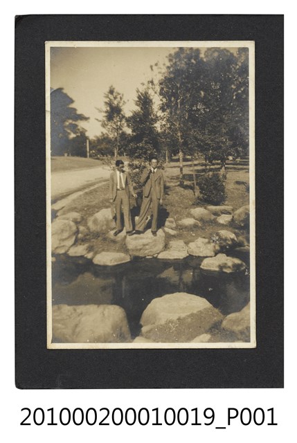二著西服男子站立在池塘旁大石上,左方為東天下,台南神社外苑即今忠義國小。