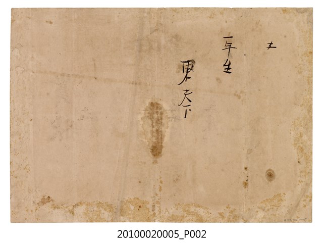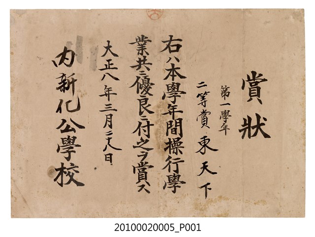 1.本物件為大正8年(1919)3月28日的學校獎狀,由內新化公學校所發,取得獎狀者為東天下,其第一學年由於操行學業優良而獲得二等賞獎狀。本文物紙質泛黃,紙張上有多處汙跡。