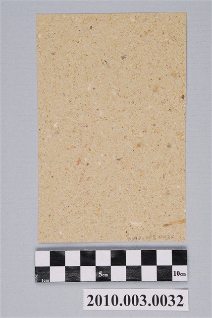 本件天官錢紙錢採直幅構圖,以朱紅色印製在土黃色的草紙之上,畫面線條有缺損現象。上端橫書「天官」二字,下方作一名古代官員裝束之神仙人物,即上元一品賜福天官紫微大帝。天官作頭戴展幞相帽,臉蓄垂髯,左手上抬作拂長髯狀,右手握腰部御帶。據入藏來源資料,本件來自宜蘭頭城茂惠紙店(茂惠金香鋪)。