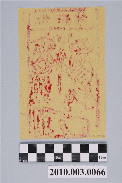 本件地獄錢紙錢採直幅構圖,以朱紅色版印製在黃色草紙上,紋樣線條部份缺損。紙錢上端框內橫書「地獄錢」三字,下方框內並立兩位作獸首人身、著鎧甲的武將,左側為牛將軍,作牛頭人身,左手在上、右手在下,握一把尖端朝上的三叉戟。右側為馬將軍,作馬頭人身,右手握一把尖端朝上的三叉戟。據入藏來源資料,本件來自宜蘭金成利金紙舖。