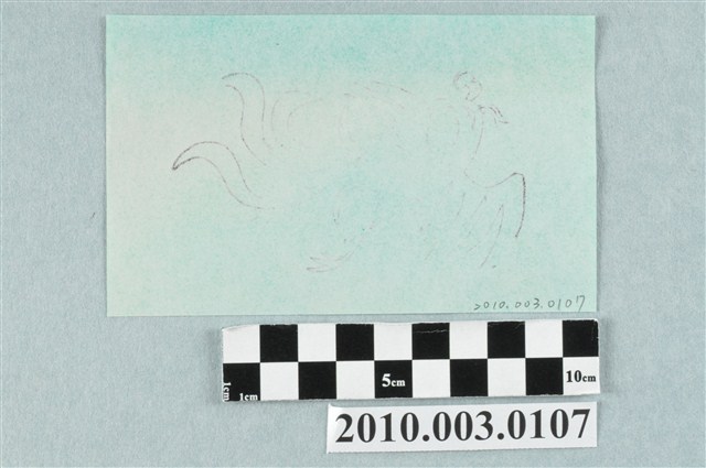 本件婆姐衣紙錢為五色婆姐衣之一,以墨版印製於單面綠色紙張之上。紙錢面上印製一隻鳳鳥,頭部在左作回首貌,頭頂有羽冠,兩翅展開作飛翔狀,左腳彎曲朝前,右腳伸直朝後,尾羽朝後飄動。據入藏來源資料,本件來自宜蘭頭城游福磚金紙店。