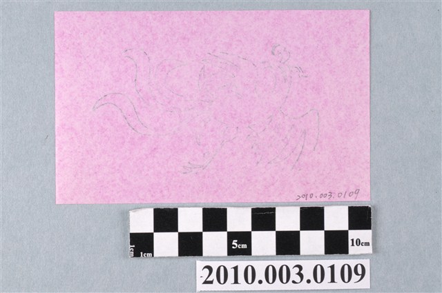 本件婆姐衣紙錢為五色婆姐衣之一,以墨版印製於單面洋紅色紙張之上。紙錢面上印製一隻鳳鳥,頭部在左作回首貌,頭頂有羽冠,兩翅展開作飛翔狀,左腳彎曲朝前,右腳伸直朝後,尾羽朝後飄動。據入藏來源資料,本件來自宜蘭頭城游福磚金紙店。