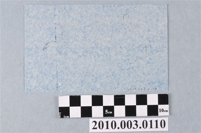 本件婆姐衣紙錢為五色婆姐衣之一,以墨版印製於單面靛青色紙張之上。紙錢面上印製一隻鳳鳥,頭部在左作回首貌,頭頂有羽冠,兩翅展開作飛翔狀,左腳彎曲朝前,右腳伸直朝後,尾羽朝後飄動。據入藏來源資料,本件來自宜蘭頭城游福磚金紙店。