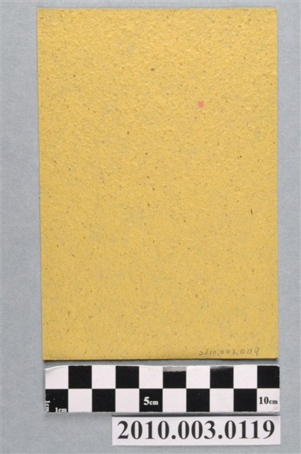 本件水府錢紙錢以朱紅色版印製於黃色草紙之上。紙錢做直式長方形畫面,以粗線為外框,上方橫框內書「水府錢」三字,下方框內作一名站立於水面上的神吏,龍頭人身,作龍王相貌,左手上舉持一面三角旗,右手握腰帶,為水府之神。據入藏來源資料,本件來自宜蘭羅東正義紙莊。