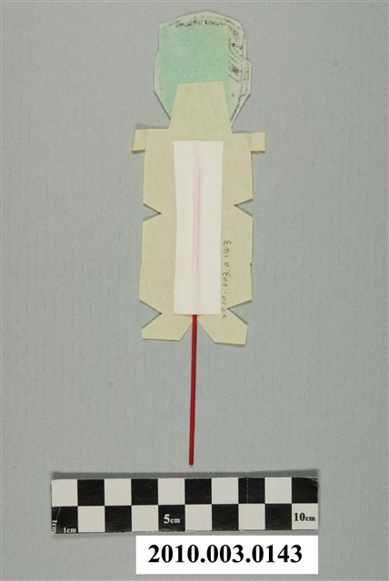 本件女性替身紙像頭部以墨版印製在淺綠色紙張之上,根據外沿剪裁後,張貼於以黃紙剪裁的身軀上,背後黏上一根香腳以利立起。替身紙像臉部娟秀,前額做瀏海髮式,頭戴圈帽,帽沿正前方書一「女」字,身軀外形簡略,約略顯示雙手、上身、下身與雙腳。據入藏來源資料,本件來自宜蘭頭城游福磚金紙店。
