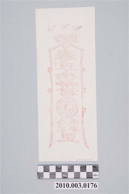 本件孚佑帝君平安符以朱色版印製於米黃色紙張之上。符頭書三個V符號,象徵道教至尊三清道祖,符身上端書「勅令」二字,令字之左右兩撇往下延伸,並各圈出三個小圓圈,其內上方直書「孚佑帝君」,其下為一方先天八卦圖,接下區分兩行直書「合家平安」四字,符腳為「罡」字。