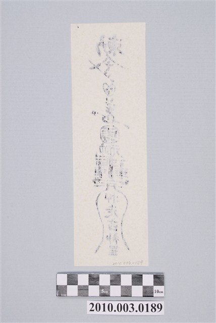 本件押走凶神符以墨版印製於米黃色紙張之上,符頭直書「勅令」二字,其下為一個往右上方挑出的V符號,上方加上兩點以代表道教至尊神三清道祖。符身最上方作一個心形符號,其下為「羊」字頭接太極符號,下方圓圈內書一「雷」字,圓圈下方為「元帥」複合字與「轟」字,下方又以開字往下延伸出寶蓋線條,其內直書「押走凶神」,符腳押一「罡」字。