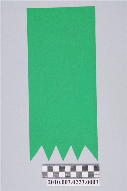 本件為天官賜福掛箋組之一,以墨版印製於綠色紙張之上。掛箋作長條形,下端作鋸齒形剪裁,最上端在方框內書「天官賜福」,畫面中央主要為天官之像。天官作古代文官造形,頭戴展翅相帽,身穿官袍,臉蓄長髯,左手上舉,右手左伸於腹前,合持一方捲軸。天官左後方立一名手持長柄如意團扇之侍女,身右立一孩童,上下各有一道捲草紋花邊,最下端作花朵紋。據入藏來源資料,本組來自宜蘭市寬仁芳商號,木雕印版為登錄號2010.003.0347,由木雕匠師蔡火土於日本時代1940年代所刻製。