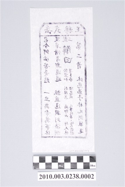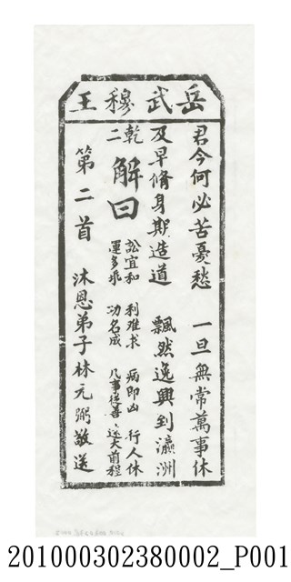 寺廟籤詩的基本架構有三種,一是來自於「甲子籤詩」的六十甲子數法,二是八卦命理思維的六十四卦排列,三是以九九極數加籤王而成百數籤詩。本件宜蘭碧霞宮岳武穆王籤詩木刻拓本屬於第二種六十四卦的籤詩的第二首。籤詩內容結構是上方梯形格內由右而左橫書「岳武穆王」四字,下方則是直書,由右至左排列七言律詩「君今何必苦憂愁,一旦無常萬事休。及早修身期造道,飄然逸興到瀛洲。」、「二乾 解曰:訟和、利難求、病即凶、運多乖、功名成、几事從善、遠大前程」、「第二首 沐恩弟子林元弼敬送」等三部份。