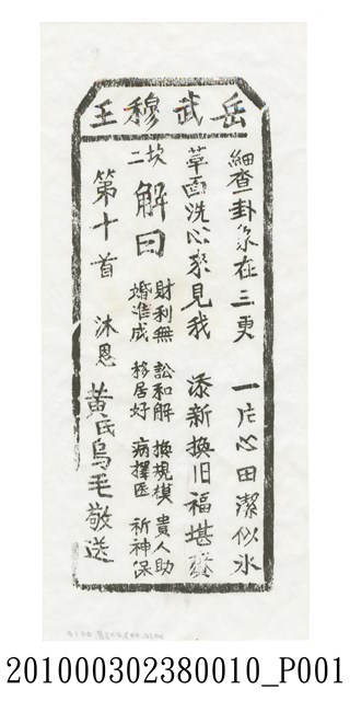 寺廟籤詩的基本架構有三種,一是來自於「甲子籤詩」的六十甲子數法,二是八卦命理思維的六十四卦排列,三是以九九極數加籤王而成百數籤詩。本件宜蘭碧霞宮岳武穆王籤詩木刻拓本屬於第二種六十四卦的籤詩的第十首。籤詩內容結構是上方梯形格內由右而左橫書「岳武穆王」四字,下方則是直書,由右至左排列七言律詩「細查卦象在三更,一片心田潔似冰。革面洗心來見我,添新換舊福堪?。」、「二坎 解曰:財利無、訟和解、換規模、貴人助、婚難成、移居好、病擇醫、祈神保」、「第十首 沐恩弟子黃氏烏毛敬送」等三部份。