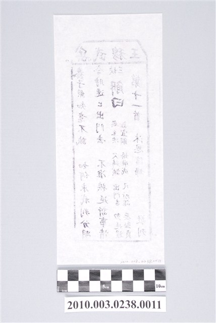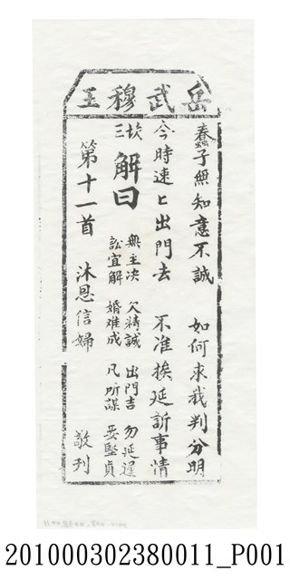寺廟籤詩的基本架構有三種,一是來自於「甲子籤詩」的六十甲子數法,二是八卦命理思維的六十四卦排列,三是以九九極數加籤王而成百數籤詩。本件宜蘭碧霞宮岳武穆王籤詩木刻拓本屬於第二種六十四卦的籤詩的第十一首。籤詩內容結構是上方梯形格內由右而左橫書「岳武穆王」四字,下方則是直書,由右至左排列七言律詩「蠢子無知意不誠,如何求我判分明。今時速速出門去,不准挨延訢事情。」、「三坎 解曰:無主決、久精誠、出門吉、勿追遲、訟宜解、婚難成、凡所謀、要堅貞」、「第十一首 沐恩信婦 敬刊」等三部份。