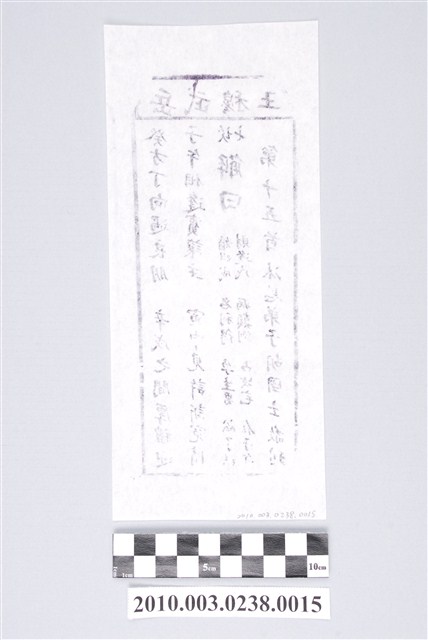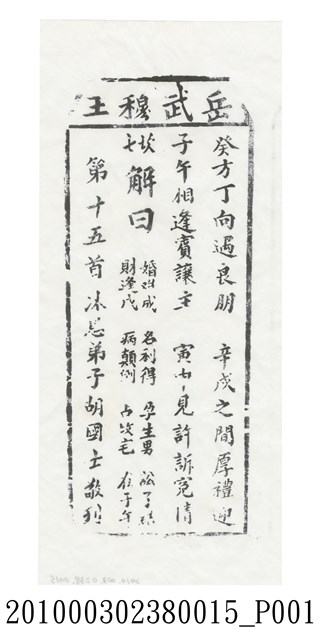 寺廟籤詩的基本架構有三種,一是來自於「甲子籤詩」的六十甲子數法,二是八卦命理思維的六十四卦排列,三是以九九極數加籤王而成百數籤詩。本件宜蘭碧霞宮岳武穆王籤詩木刻拓本屬於第二種六十四卦的籤詩的第十五首。籤詩內容結構是上方梯形格內由右而左橫書「岳武穆王」四字,下方則是直書,由右至左排列七言律詩「癸方丁向遇良朋,辛戍之間厚禮迎。子午相逢賓讓主,寅申見許訴冤情。」、「七坎 解曰:婚難成、名利得、孕生男、訟了結、財逢戍、病顛倒、占坟宅、在子午」、「第十五首 沐恩弟子胡國士敬刊」等三部份。