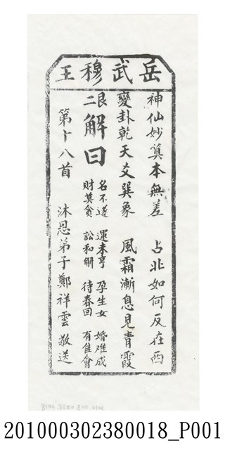 寺廟籤詩的基本架構有三種,一是來自於「甲子籤詩」的六十甲子數法,二是八卦命理思維的六十四卦排列,三是以九九極數加籤王而成百數籤詩。本件宜蘭碧霞宮岳武穆王籤詩木刻拓本屬於第二種六十四卦的籤詩的第十八首。籤詩內容結構是上方梯形格內由右而左橫書「岳武穆王」四字,下方則是直書,由右至左排列七言律詩「神仙妙算本無差,占北如何反在西。變卦乾天爻巽象,風霜漸息見青霞。」、「二艮 解曰:名不遂、運未亨、孕生女、婚難成、財莫貪、訟和解、待春回、有隹會」、「第十八首 沐恩弟子鄭祥雲敬送」等三部份。