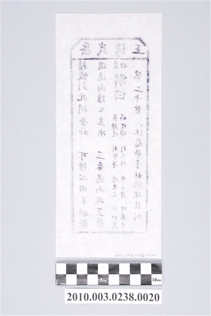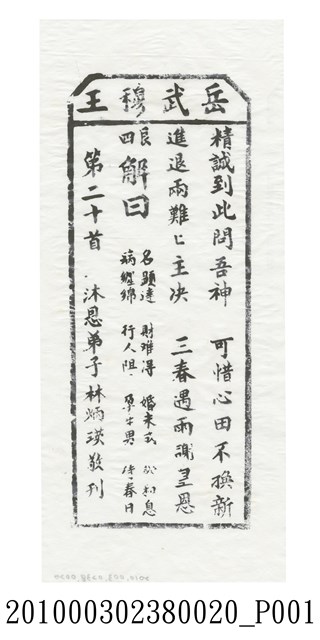 寺廟籤詩的基本架構有三種,一是來自於「甲子籤詩」的六十甲子數法,二是八卦命理思維的六十四卦排列,三是以九九極數加籤王而成百數籤詩。本件宜蘭碧霞宮岳武穆王籤詩木刻拓本屬於第二種六十四卦的籤詩的第二十首。籤詩內容結構是上方梯形格內由右而左橫書「岳武穆王」四字,下方則是直書,由右至左排列七言律詩「精誠到此問吾神,可惜心田不換新。進退兩難難主決,三春遇雨謝皇恩。」、「四艮 解曰:名顯達、財難得、婚未成、訟和息、病纏綿、行人阻、孕生男、待春日」、「第二十首 沐恩弟子林炳瑛敬刊」等三部份。