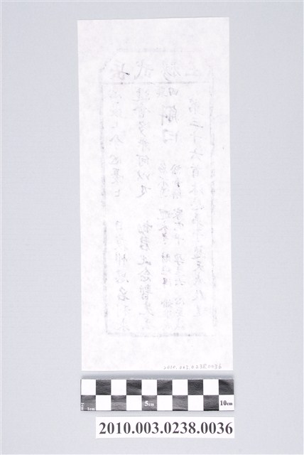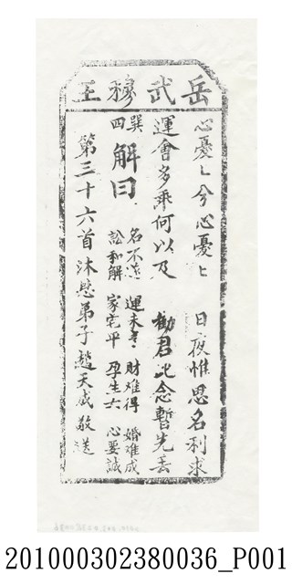寺廟籤詩的基本架構有三種,一是來自於「甲子籤詩」的六十甲子數法,二是八卦命理思維的六十四卦排列,三是以九九極數加籤王而成百數籤詩。本件宜蘭碧霞宮岳武穆王籤詩木刻拓本屬於第二種六十四卦的籤詩的第三十六首。籤詩內容結構是上方梯形格內由右而左橫書「岳武穆王」四字,下方則是直書,由右至左排列七言律詩「心憂憂兮心憂憂,日夜惟思名利求。運會多乖何以及,勸君此念暫先丟。」、「四巽 解曰:名不遂、運未亨、財難得、婚難成、訟和解、家宅平、孕生大、心要誠」、「第三十六首 沐恩弟子趙天成敬送」等三部份。