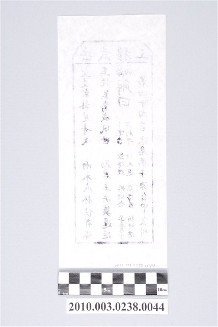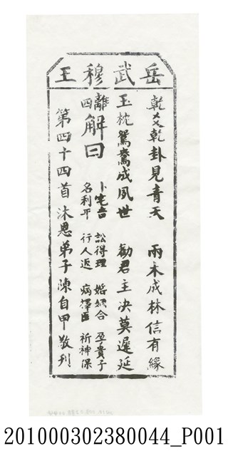 寺廟籤詩的基本架構有三種,一是來自於「甲子籤詩」的六十甲子數法,二是八卦命理思維的六十四卦排列,三是以九九極數加籤王而成百數籤詩。本件宜蘭碧霞宮岳武穆王籤詩木刻拓本屬於第二種六十四卦的籤詩的第四十四首。籤詩內容結構是上方梯形格內由右而左橫書「岳武穆王」四字,下方則是直書,由右至左排列七言律詩「乾爻乾卦見青天,雨木成林信有緣。玉枕鴛鴦成夙世,勸君主決莫遲延。」、「四離 解曰:小宅□、訟得理、婚姻合、孕貴子、名利平、行人返、病擇醫、祈神保」、「第四十四首 沐恩弟子陳自甲敬刊」等三部份。