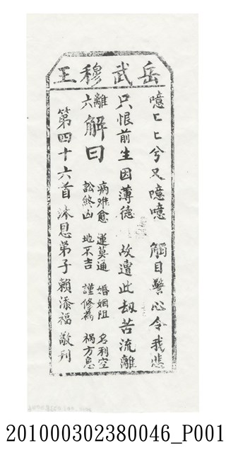 寺廟籤詩的基本架構有三種,一是來自於「甲子籤詩」的六十甲子數法,二是八卦命理思維的六十四卦排列,三是以九九極數加籤王而成百數籤詩。本件宜蘭碧霞宮岳武穆王籤詩木刻拓本屬於第二種六十四卦的籤詩的第四十六首。籤詩內容結構是上方梯形格內由右而左橫書「岳武穆王」四字,下方則是直書,由右至左排列七言律詩「噫噫噫兮只噫噫,觸目驚心令我悲。只恨前生因薄德,故遭此劫苦流離。」、「六離 解曰:病難愈、運莫通、婚姻阻、名利空、訟終凶、地不吉、謹修為、禍方息」、「第四十六首 沐恩弟子賴添福敬刊」等三部份。