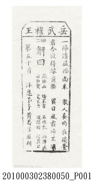 寺廟籤詩的基本架構有三種,一是來自於「甲子籤詩」的六十甲子數法,二是八卦命理思維的六十四卦排列,三是以九九極數加籤王而成百數籤詩。本件宜蘭碧霞宮岳武穆王籤詩木刻拓本屬於第二種六十四卦的籤詩的第五十首。籤詩內容結構是上方梯形格內由右而左橫書「岳武穆王」四字,下方則是直書,由右至左排列七言律詩「一陣清風拂面來,歌人奏曲在樓台。君今欲得眼前樂,異日風霜掃不開。」、「二坤 解曰:訟終凶、婚不宜、名難就、病擇醫、財勿貪、宅不吉、運雖好、防異日」、「第五十首 沐恩弟子黃番蓮敬刊」等三部份。