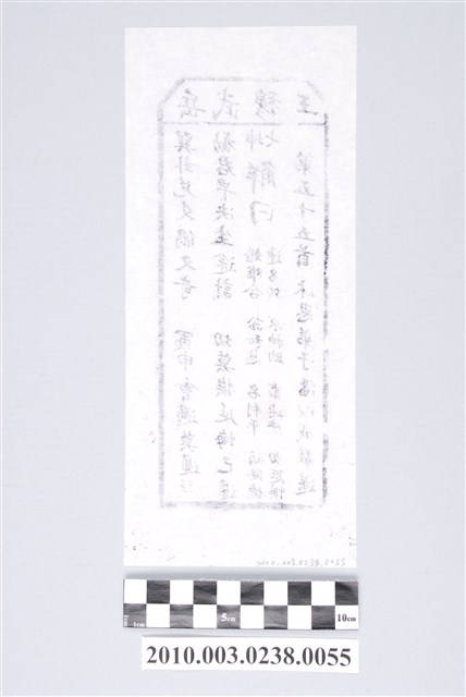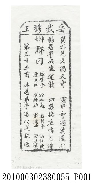 寺廟籤詩的基本架構有三種,一是來自於「甲子籤詩」的六十甲子數法,二是八卦命理思維的六十四卦排列,三是以九九極數加籤王而成百數籤詩。本件宜蘭碧霞宮岳武穆王籤詩木刻拓本屬於第二種六十四卦的籤詩的第五十五首。籤詩內容結構是上方梯形格內由右而左橫書「岳武穆王」四字,下方則是直書,由右至左排列七言律詩「巽卦兌爻偶又奇,寅申會遇莫遲疑。勸君早決生途計,切莫挨延悔已遲。」、「七坤 解曰:婚難合、訟和息、名利平、病修德、運多舛、求神助、事速決、勿追悞」、「第五十五首 沐恩弟子潘以成敬送」等三部份。