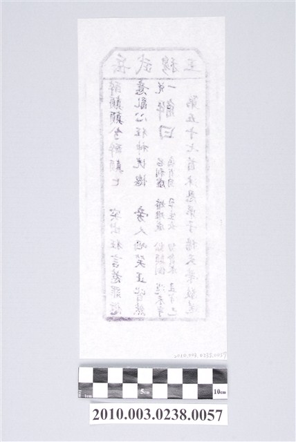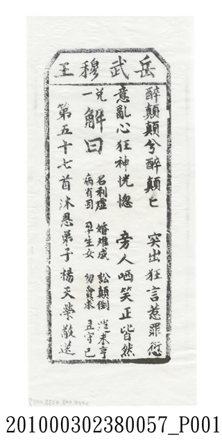 寺廟籤詩的基本架構有三種,一是來自於「甲子籤詩」的六十甲子數法,二是八卦命理思維的六十四卦排列,三是以九九極數加籤王而成百數籤詩。本件宜蘭碧霞宮岳武穆王籤詩木刻拓本屬於第二種六十四卦的籤詩的第五十七首。籤詩內容結構是上方梯形格內由右而左橫書「岳武穆王」四字,下方則是直書,由右至左排列七言律詩「醉顛顛兮醉顛顛,突出狂言惹罪愆。意亂心狂神恍惚,旁人哂笑正皆然。」、「一兌 解曰:名利虛、婚難成、訟顛倒、運未亨、病有因、孕生女、勿貪求、且守己」、「第五十七首 沐恩弟子楊天榮敬送」等三部份。