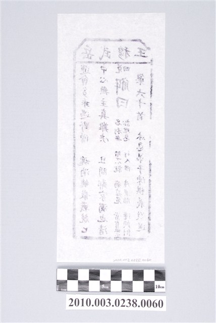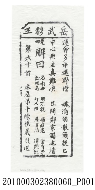 寺廟籤詩的基本架構有三種,一是來自於「甲子籤詩」的六十甲子數法,二是八卦命理思維的六十四卦排列,三是以九九極數加籤王而成百數籤詩。本件宜蘭碧霞宮岳武穆王籤詩木刻拓本屬於第二種六十四卦的籤詩的第六十首。籤詩內容結構是上方梯形格內由右而左橫書「岳武穆王」四字,下方則是直書,由右至左排列七言律詩「運會多乖遇野僧,魂消魄散戰兢兢。中心無主真難決,且問鄰家濁也清。」、「四兌 解曰:名利無、婚不就、病症危、常有崇、訟難息、行人阻、產異胎、運顛倒」、「第六十首 沐恩弟子陳棋義敬送」等三部份。