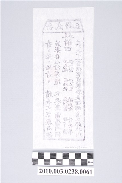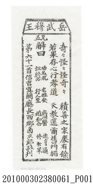 寺廟籤詩的基本架構有三種,一是來自於「甲子籤詩」的六十甲子數法,二是八卦命理思維的六十四卦排列,三是以九九極數加籤王而成百數籤詩。本件宜蘭碧霞宮岳武穆王籤詩木刻拓本屬於第二種六十四卦的籤詩的第六十一首。籤詩內容結構是上方梯形格內由右而左橫書「岳武穆王」四字,下方則是直書,由右至左排列七言律詩「奇奇怪怪怪奇奇,積善之家慶有餘。若果存心行孝道,天教還爾舊門楣。」、「五兌 解曰:功名就、宅難安、病問醫、運亨通、訟終凶、行人至、婚和合、修善果」、「第六十一首信官宜蘭廳長西鄉菊次郎敬刊」等三部份。