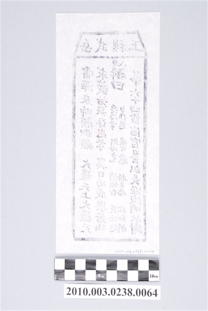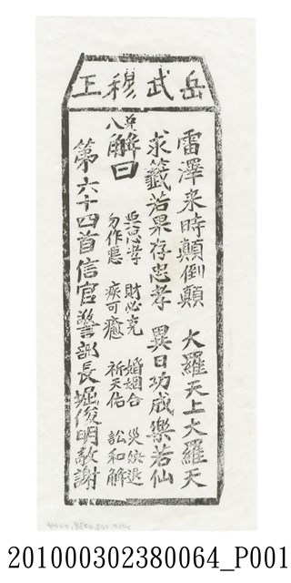 寺廟籤詩的基本架構有三種,一是來自於「甲子籤詩」的六十甲子數法,二是八卦命理思維的六十四卦排列,三是以九九極數加籤王而成百數籤詩。本件宜蘭碧霞宮岳武穆王籤詩木刻拓本屬於第二種六十四卦的籤詩的第六十四首。籤詩內容結構是上方梯形格內由右而左橫書「岳武穆王」四字,下方則是直書,由右至左排列七言律詩「雷澤來時顛倒顛,大羅天上大羅天。求籖若果存忠孝,異日功成樂若仙。」、「八兌 解曰:要忠孝、財必克、婚姻合、災殃退、勿作惡、疾可癒、祈天佑、訟和解」、「第六十四首 信官警部長堀俊明敬謝」等三部份。