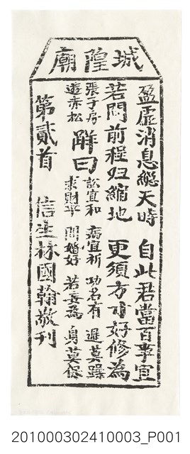 本件為木雕印版所印刷的宜蘭城隍廟第貳首之籤詩,籤詩頭刻有「城隍廟」,下方詩句「盈虛消息縂天時,自此君當百事宜;若問前程归縮地,更須方寸好修為。」以及籤詩序號、內容、歷史典故、諸事吉凶、捐獻者姓名。宜蘭城隍廟創立於嘉慶18年(1813),主祀神城隍爺。一套籤的數量有36、60、100、120等等,籤詩普遍涵蓋人生面相的正負解釋,藉由解籤人或求籤人的主客觀判斷,解惑尋求化解之道,是民眾的一種心理諮商管道。