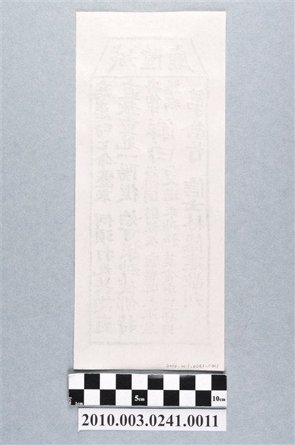 本件為木雕印版所印刷的宜蘭城隍廟第拾首之籤詩,籤詩頭刻有「城隍廟」,下方詩句「病患時時命蹇衰,何須打□共讚龜;直教重見一陽復,始可求神仗佛持。」以及籤詩序號、內容、歷史典故、諸事吉凶、捐獻者姓名。宜蘭城隍廟創立於嘉慶18年(1813),主祀神城隍爺。一套籤的數量有36、60、100、120等等,籤詩普遍涵蓋人生面相的正負解釋,藉由解籤人或求籤人的主客觀判斷,解惑尋求化解之道,是民眾的一種心理諮商管道。